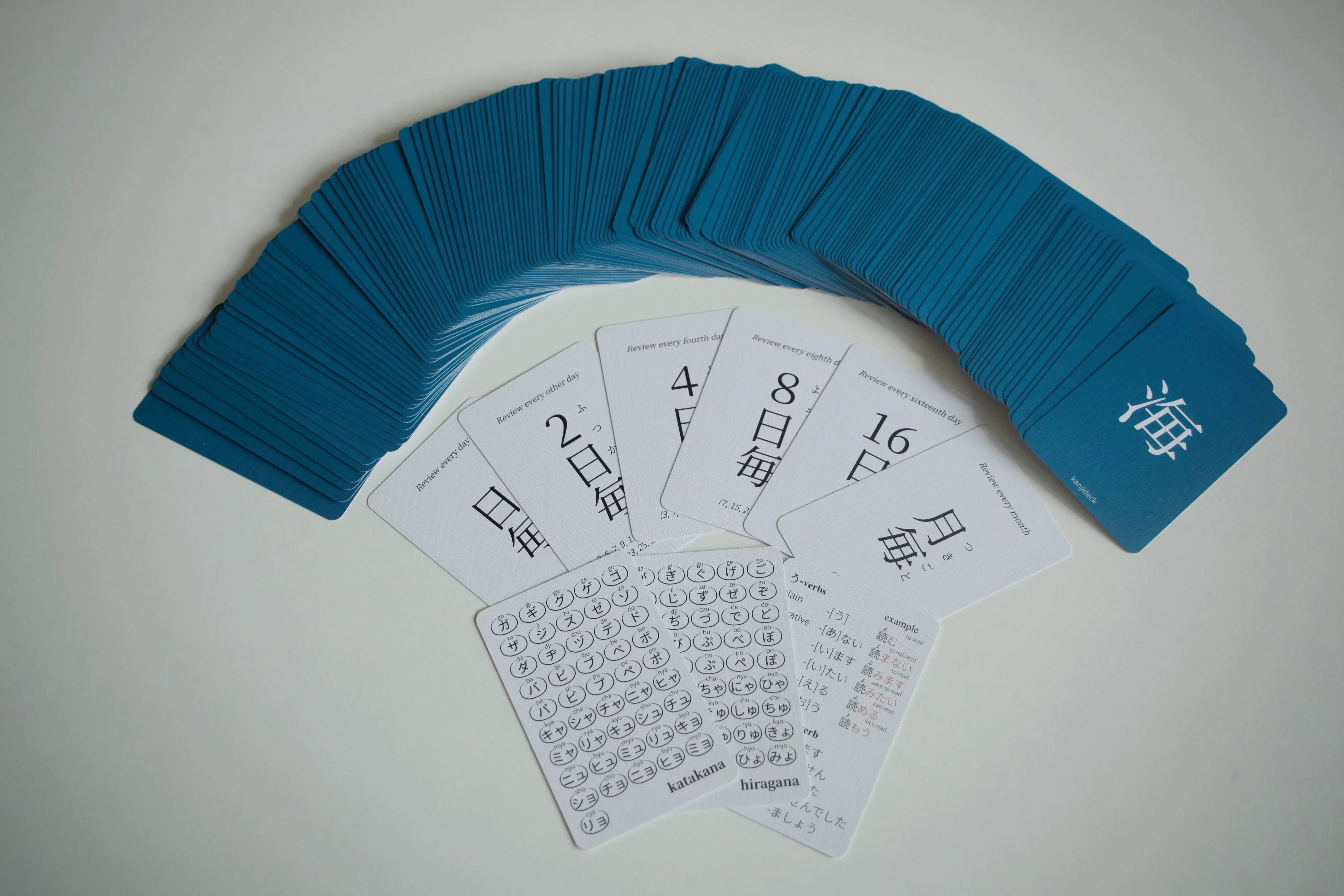 The standard green Kanji deck has in total 90 physical cards to help you learn all first 80 Kanji characters commonly needed for the first level of the official Japanese language proficiency test (JLPT-5).