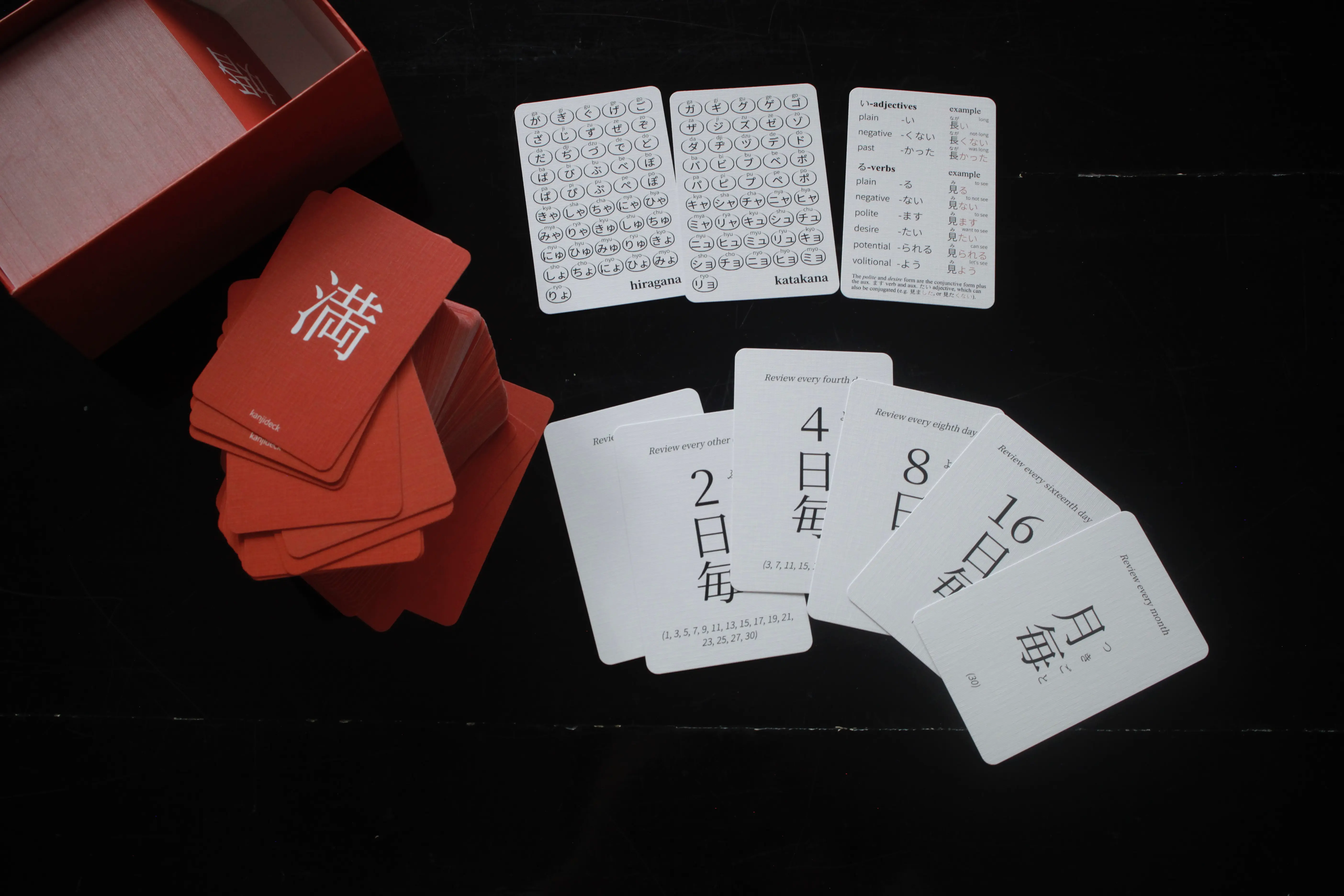 The other 10 cards are the tutorial, the hiragana and katakana reference cards, a cheatsheet card for conjugating verbs and adjectives, and 6 cards to form a physical spaced-repetition system.